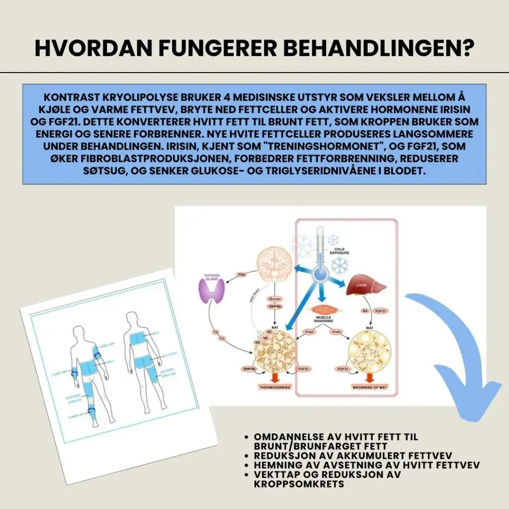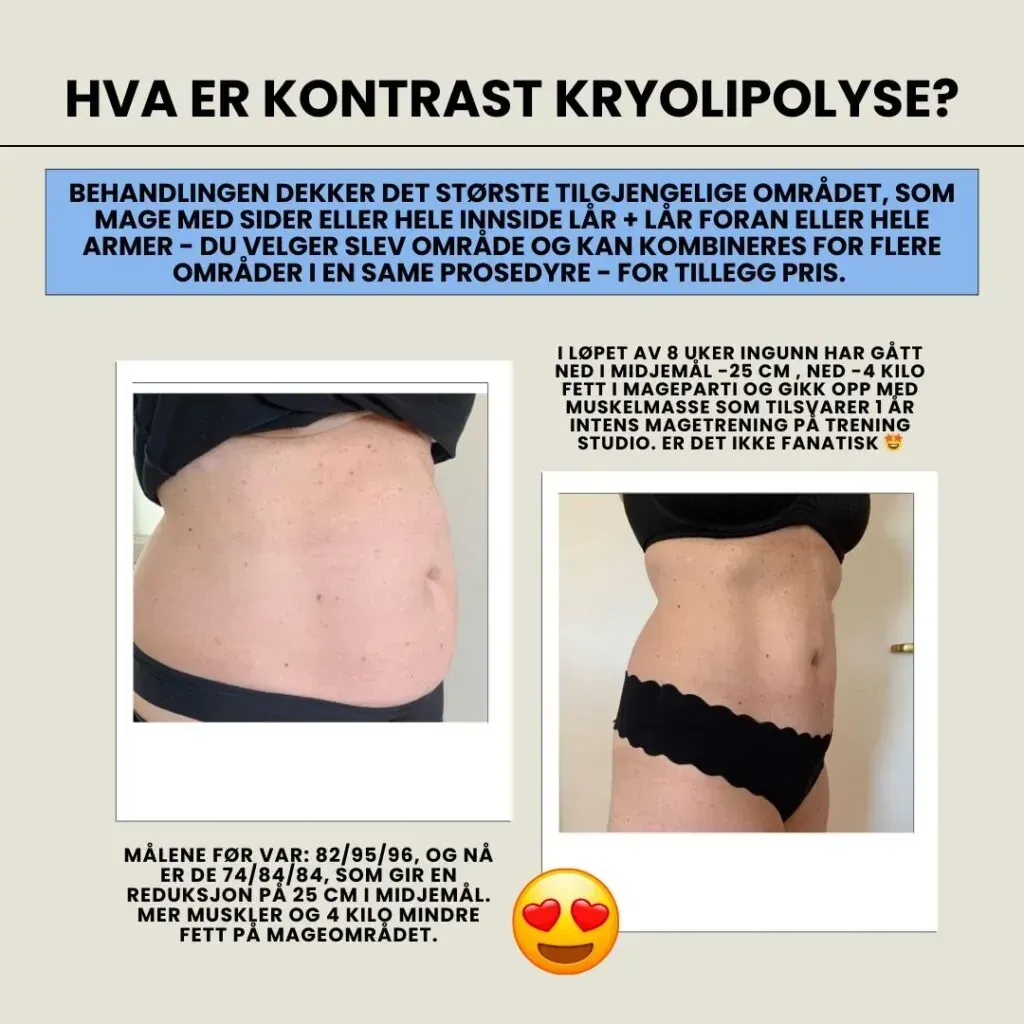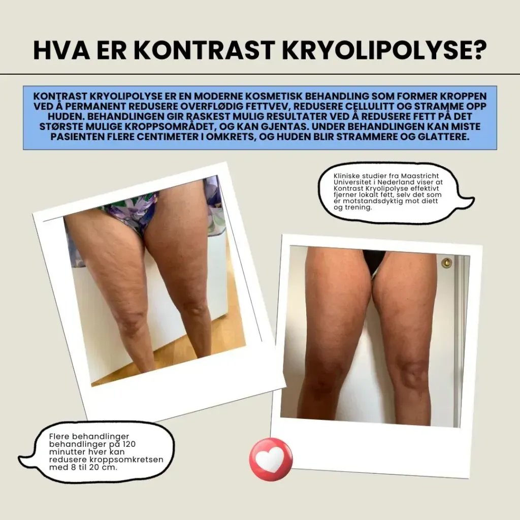 Kontrast kryolipolyse er en moderne kosmetisk behandling som former kroppen ved å permanent redusere overflødig fettvev, redusere cellulitter og stramme opp huden. Behandlingen bruker 4 typer medisinsk utstyr som veksler mellom å kjøle og varme fettvev. Dette konverter hvitt fett til brunt fett, som kroppen bruker som energi og senere forbrenner.